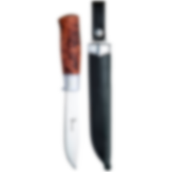 Knivbladet har en skandinavisk raktskuren design. Slidan har ett metallband som går runt hela manteln och ger extra styrka. Kniven har även en slida i gjuten aluminium med fingerskydd, vilket ger extra säkerhet om du skulle ha otur och tappa greppet om kniven. Bladet är tillverkat av Sandvik 12C27 stål, känt för sin hållbarhet och lätthet att slipa om. Skaftet är tillverkat av oljad och betsad Masurbjörk. Kniven levereras med läderslida och en vacker presentask.