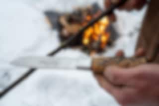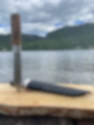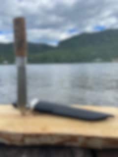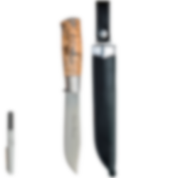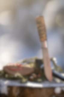 Bladet är tillverkat av Sanvik stål, känt för sin hållbarhet och lätthet att slipa. Skaftet är gjort av noggrant behandlad masurbjörk, vilket ger både ett vackert och funktionellt grepp. Kniven levereras med en stilren läderslida för säker förvaring och enkel åtkomst.