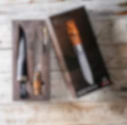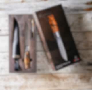 Kniven levereras i en elegant presentask som också innehåller en liten diamantbryne med tre praktiska funktioner: en för slät egg, en för tandad egg, och ett spår speciellt designat för att vässa fiskekrokar. Det bakslipade bladet gör att du kan använda ryggen mot tändstål, vilket skyddar eggen från slitage.