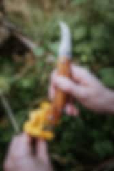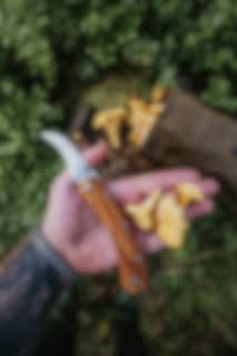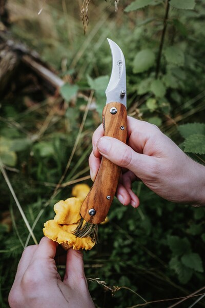 Kniven har en avrundad spets som gör det enklare att skära loss svampen nära roten, samtidigt som man undviker att skada mycelet – det underjordiska svampnätverket som gör att nya svampar kan växa fram på samma plats.