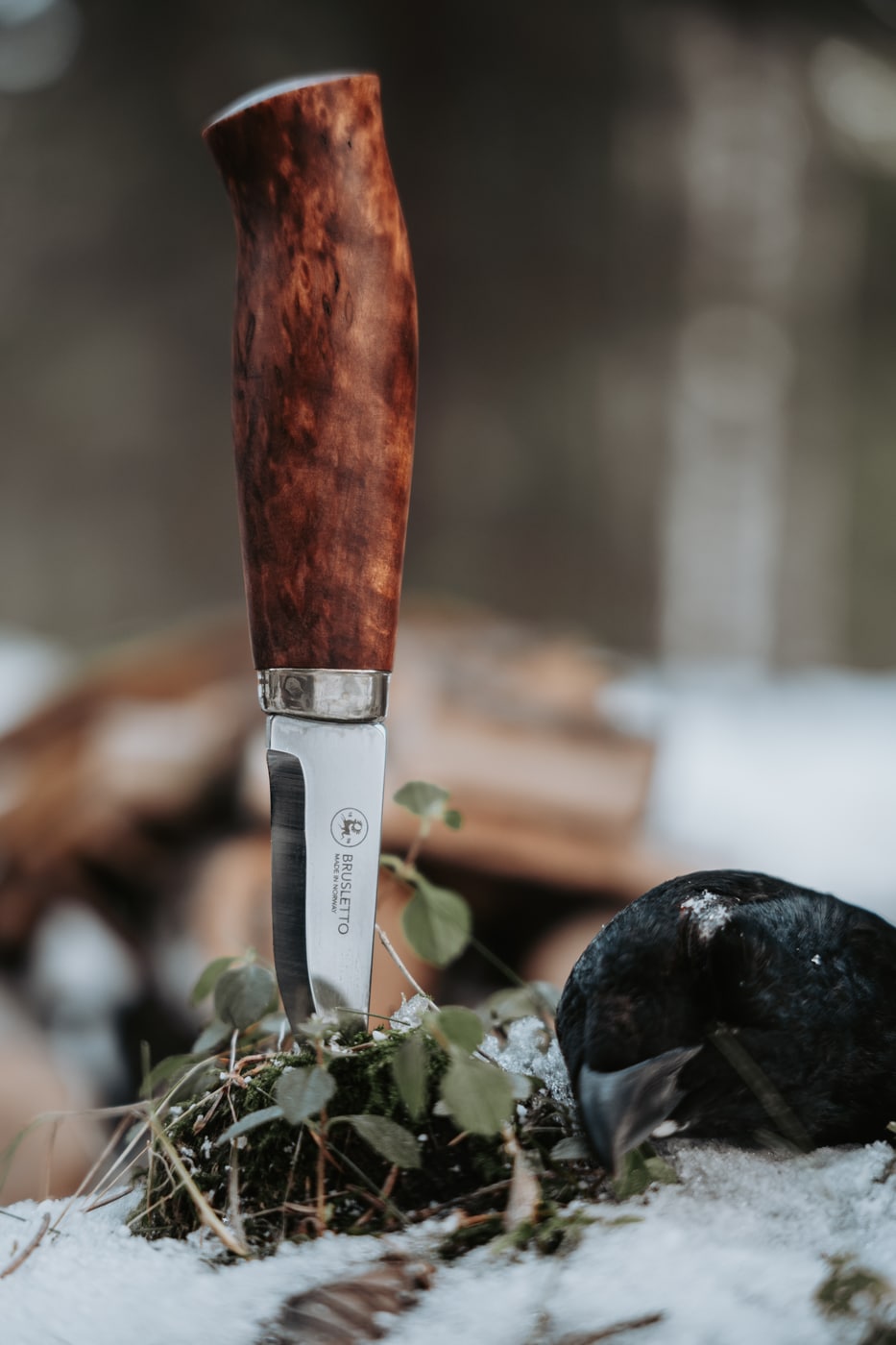 Liten allroundkniv som passar bra till småviltsjakt. Sandvik stål i knivbladet som är enkelt att slipa upp. Oljad flambjörk i skaftet.