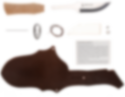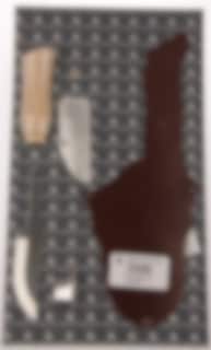 Läderbit, nål, tråd, säkerhetsinlägg, grovformat fjällbjörksämne, holk och Falken knivblad.