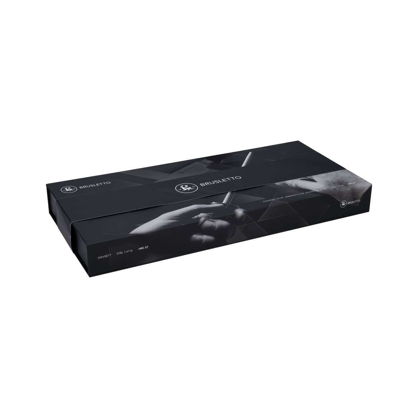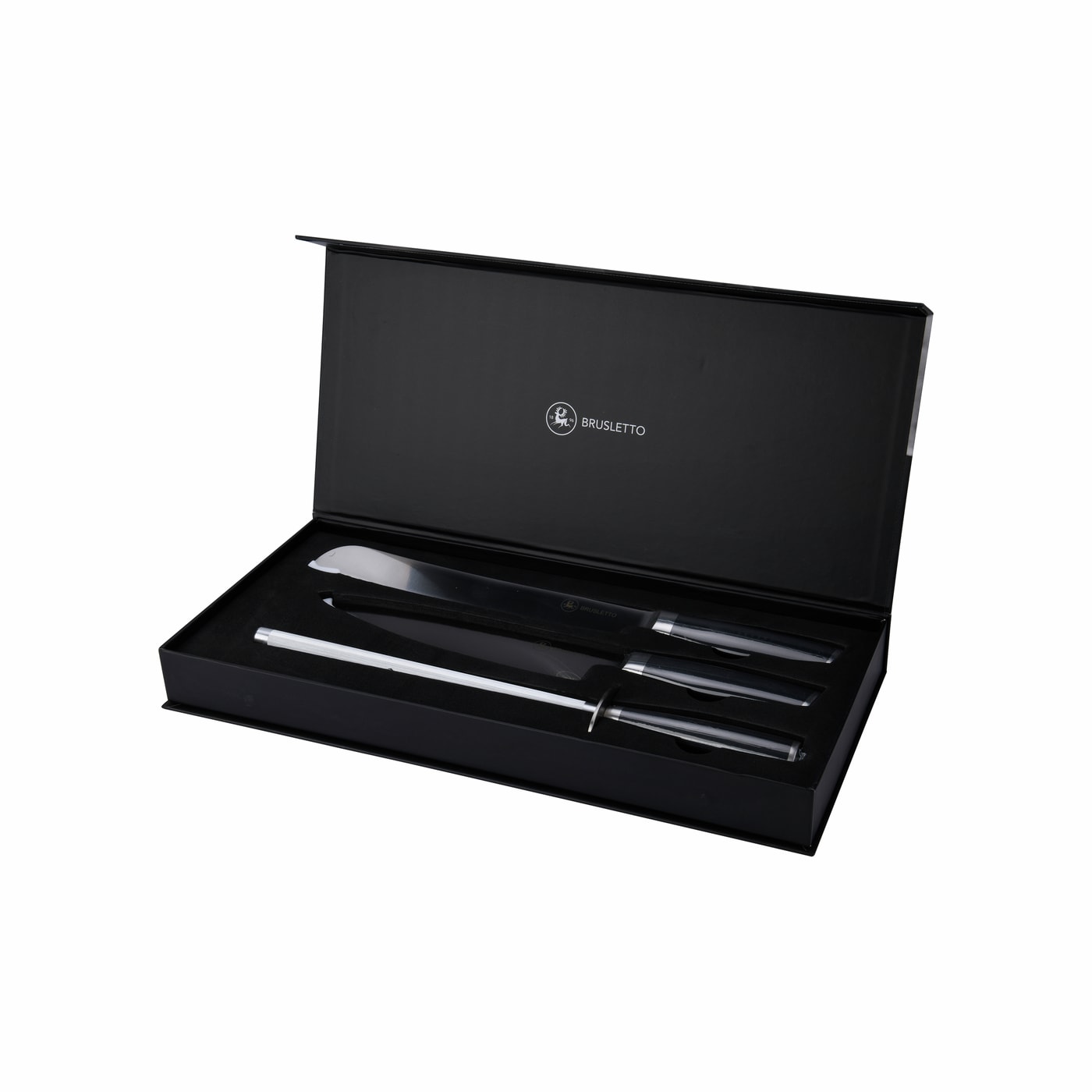 Uppsättning av kockkniv, brödkniv och slipstål i presentask.